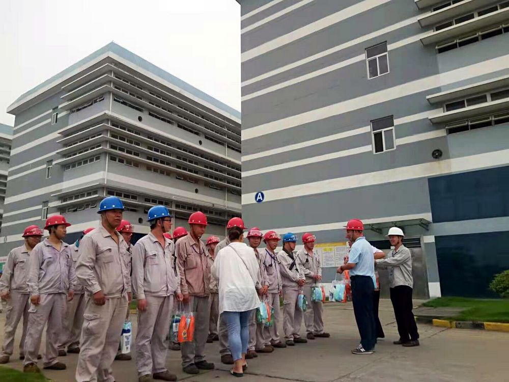 上午8點(diǎn)50分,一線員工代表在班長的指揮下,快速來到廠區(qū)指定地點(diǎn),列隊(duì)排開,精神抖擻,歡迎園區(qū)總工會(huì)的到來。園區(qū)領(lǐng)導(dǎo)們?yōu)榇蠹宜蛠砹讼醋o(hù)套裝、毛巾、風(fēng)油精、花露水等夏季清涼用品,與一線員工親切握手并將清涼用品一一送交大家手中,囑咐大家注意防暑降溫,并希望企業(yè)合理安排好員工的作息,抓好安全生產(chǎn)工作。