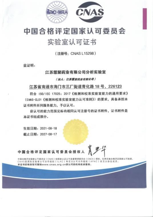 2021年8月18日,江蘇慧聚藥業(yè)有限公司通過審核,取得CNAS認(rèn)證證書。此次獲得CNAS審核,既是對分析實(shí)驗(yàn)室的技術(shù)實(shí)力及體系管理實(shí)力的認(rèn)可,也是慧聚藥業(yè)建設(shè)國際一流實(shí)驗(yàn)室道路上的關(guān)鍵一步。面向未來,分析實(shí)驗(yàn)室將繼續(xù)秉承“數(shù)據(jù)準(zhǔn)確、運(yùn)轉(zhuǎn)高效、行為公正、態(tài)度嚴(yán)謹(jǐn)”的質(zhì)量方針,嚴(yán)格按照法規(guī)要求、體系要求、國際標(biāo)準(zhǔn)、國內(nèi)標(biāo)準(zhǔn)認(rèn)真控制各檢測環(huán)節(jié),發(fā)揮各職能部門功能,完成各項(xiàng)檢測任務(wù),以專業(yè)的技術(shù)支持,確保檢測報(bào)告的準(zhǔn)確及時,持續(xù)提升客戶滿意度。